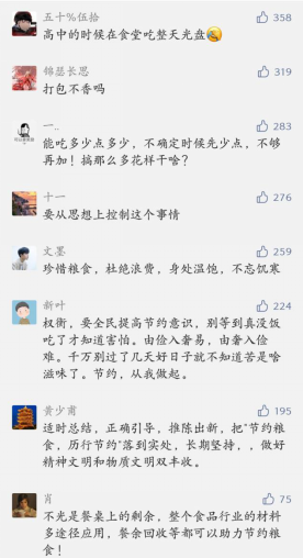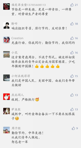 为使此次活动能够达到最好的宣传效果,呼吁3377体育全体师生参与进来,活动正式开始之前青师文苑公众号推送“厉行节约,反对餐饮浪费”倡议书,鼓励全院员工评论留言,承诺用实际行动践行勤俭节约,激励青年学子用实际行动演绎新时代师大学子的新风尚。同学们在公众号下踊跃留言,结合自己的实际,评说了在平时生活中常见的浪费粮食的现象并表达将在以后得生活中贯彻厉行节约,反对浪费的决心。通过这种形式让节约、节俭的精神更加深入同学们的心中,更好的弘扬中华民族"节约、朴素"的传统美德。