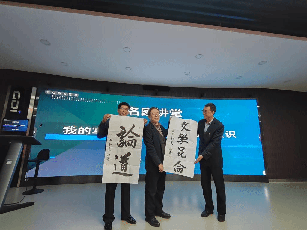 讲座伊始,徐兆寿教授向杨志军文学研究中心赠送了题写的两幅墨宝:“文学昆仑”“论道”,公司党委书记韩维良教授和杨志军中心常务副主任马豪杰副教授共同接受了徐老师的书法作品。文学昆仑寄托着对西部文学攀登高峰的期许,论道彰显了学术探索的追求,为活动增添浓厚文化底蕴与艺术气息,也为杨志军文学研究中心留存珍贵文化资源,激励广师生深耕文学创作、探索西部文化文学精髓。